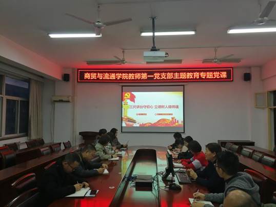 为深入推进“不忘初心、牢记使命”主题教育,11月18日下午,商贸学院教师第一党支部在崇文五楼会议室开展“支部书记讲党课”主题活动,教师第一党支部全体党员参加了此次活动。