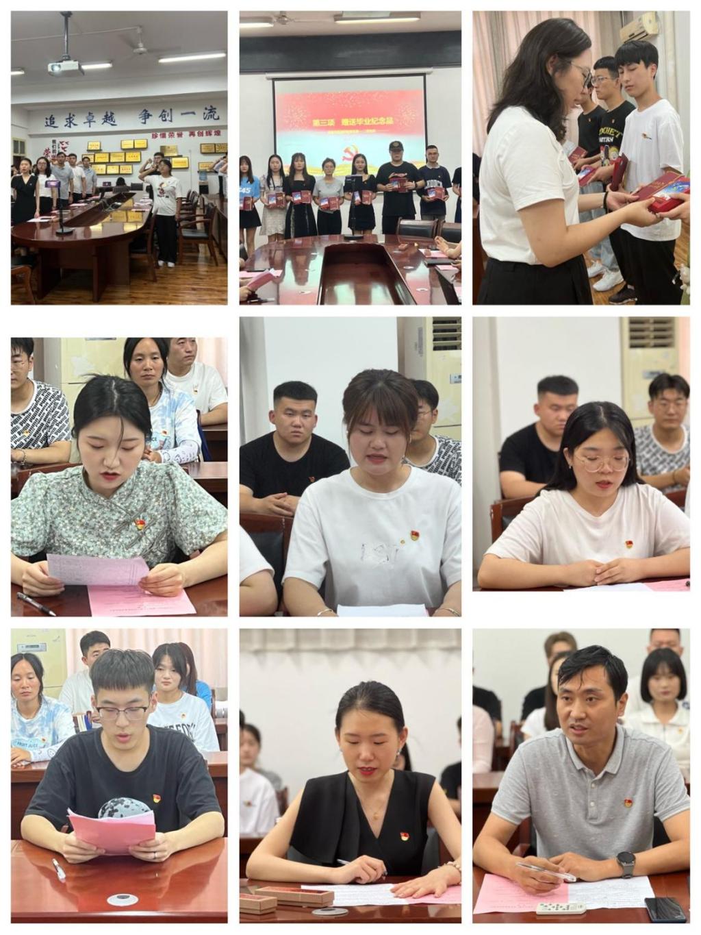 重温誓词悟初心。党日活动在《国际歌》中拉开序幕,全体党员面向党旗,庄严举起右拳,重温入党誓词,在铿锵誓言中回首入党初心,汲取前行力量。重忆初心,初心始终如磐;坚守使命,使命始终在肩。随后,与会教师党员向毕业班党员送上毕业贺卡和纪念品,勉励他们走出校门后始终饱含感恩之心、报国之志。