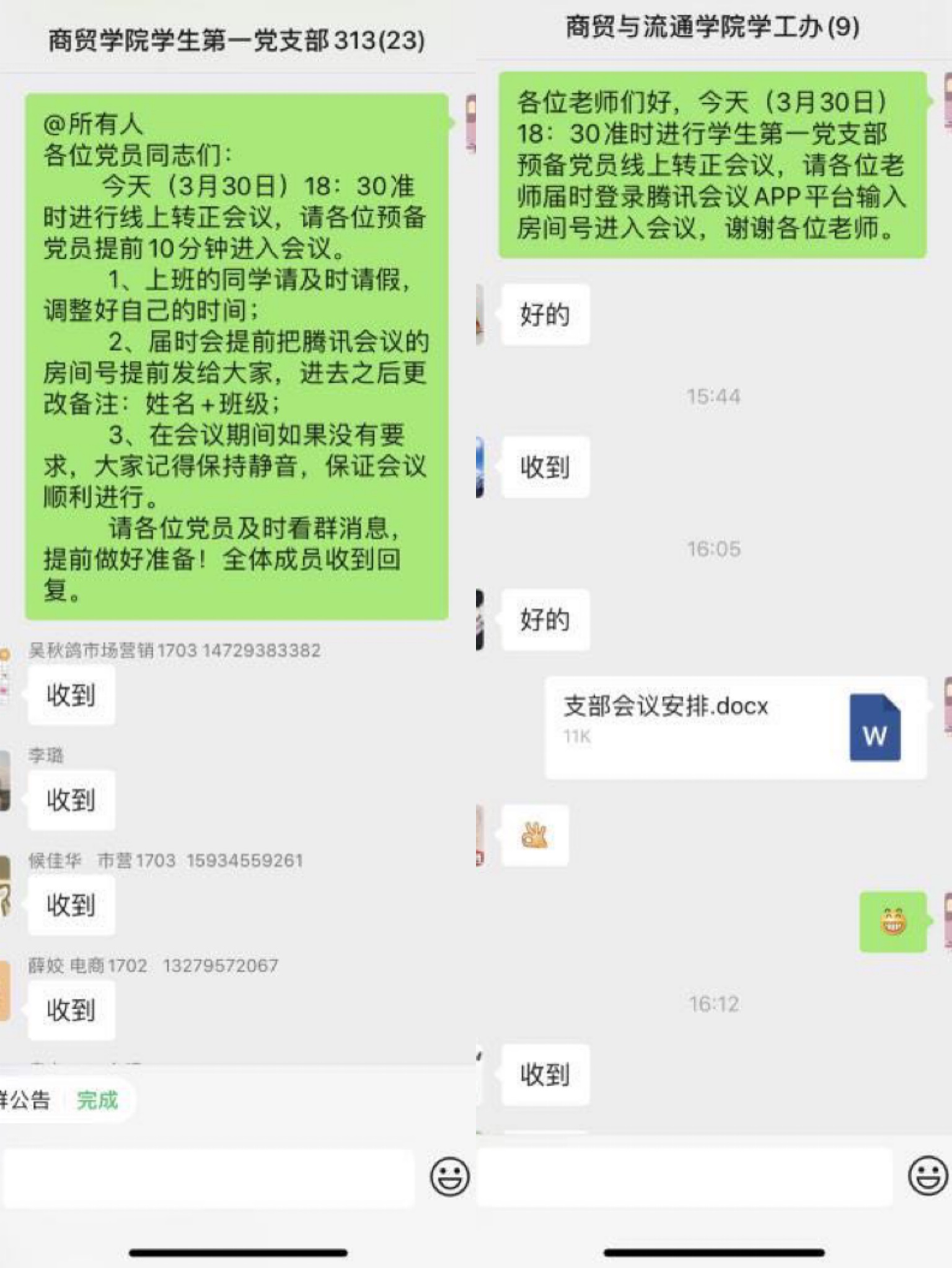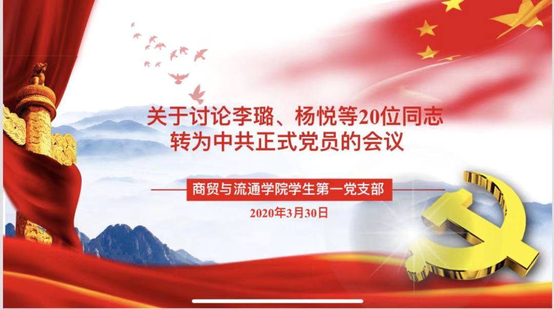 受疫情影响,开学时间延迟。但3月份商贸与流通学院李璐等20名预备党员一年预备期满,按期给学生第一党支部递交了转正申请。支委会研究决定,不能让疫情阻挡党建工作的正常开展,把党员转正工作搬到“云端”进行。支委会制订了详细的预备党员线上转正流程。20名拟转正预备党员录制短视频,详细汇报自己一年预备期现实表现。党支部广泛征求了党内外群众对党员意见,并严格审查了其相关资料,为转正大会做好了充分准备。