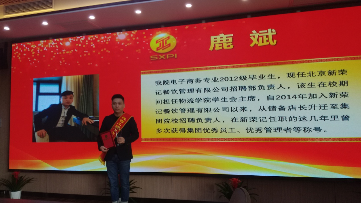 鹿斌,现为北京新荣记餐饮管理有限公司首席招聘官,2013年9月当选物流管理学院学生会主席;2014年11月,入职北京新荣记餐饮管理有限公司,被集团破格提升为储备店长;2017年,北京新荣记餐饮管理有限公司担任招聘经理;2020年起担任新荣记集团首席招聘官,联合部分合作单位成立的现代师徒班,于2020年通过国家验收,校企合作共建贫困生新荣记订单班也已经成立,为决战脱贫攻坚贡献一份力量。