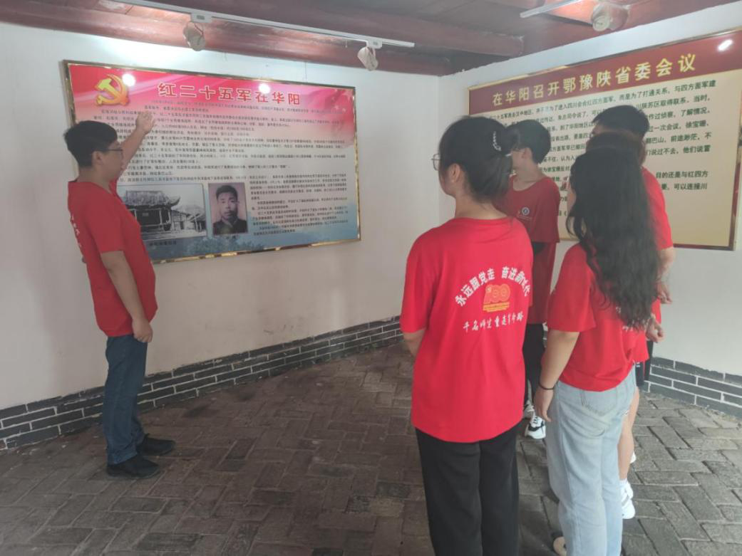汲取革命力量。实践团的队员们参观华阳红二十五军司令部旧址。宣讲团成员王倩同学讲解了在此发生的重大战役石塔寺伏击战,号召大家学习先辈革命精神,坚定力量信念。心中有信念,脚下才有力量。带队老师万永亮给同学们详细讲解了对红二十五军在华阳所发生的历史故事,要求队员们要以革命先辈的英勇事迹汲取前进的力量,接好历史的接力棒,努力成为立大志、明大德、成大才、担大任的时代新人。