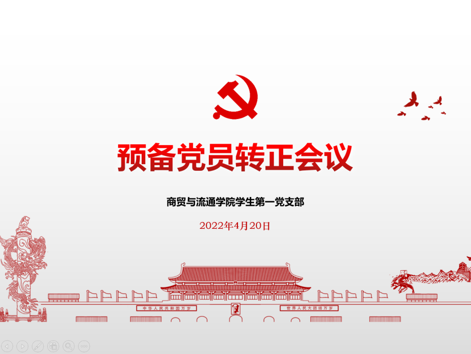 2022年4月20日下午,商贸与流通学院学生第一党支部在崇文北楼2楼党员活动室召开预备党员转正大会,讨论预备党员王佳星等34位同志转正相关事宜。会议由商贸与流通学院学生第一党支部书记万永亮主持,学生第一党支部全体党员出席会议。受疫情影响,本次预备党员转正大会采取线上线下相结合形式进行。