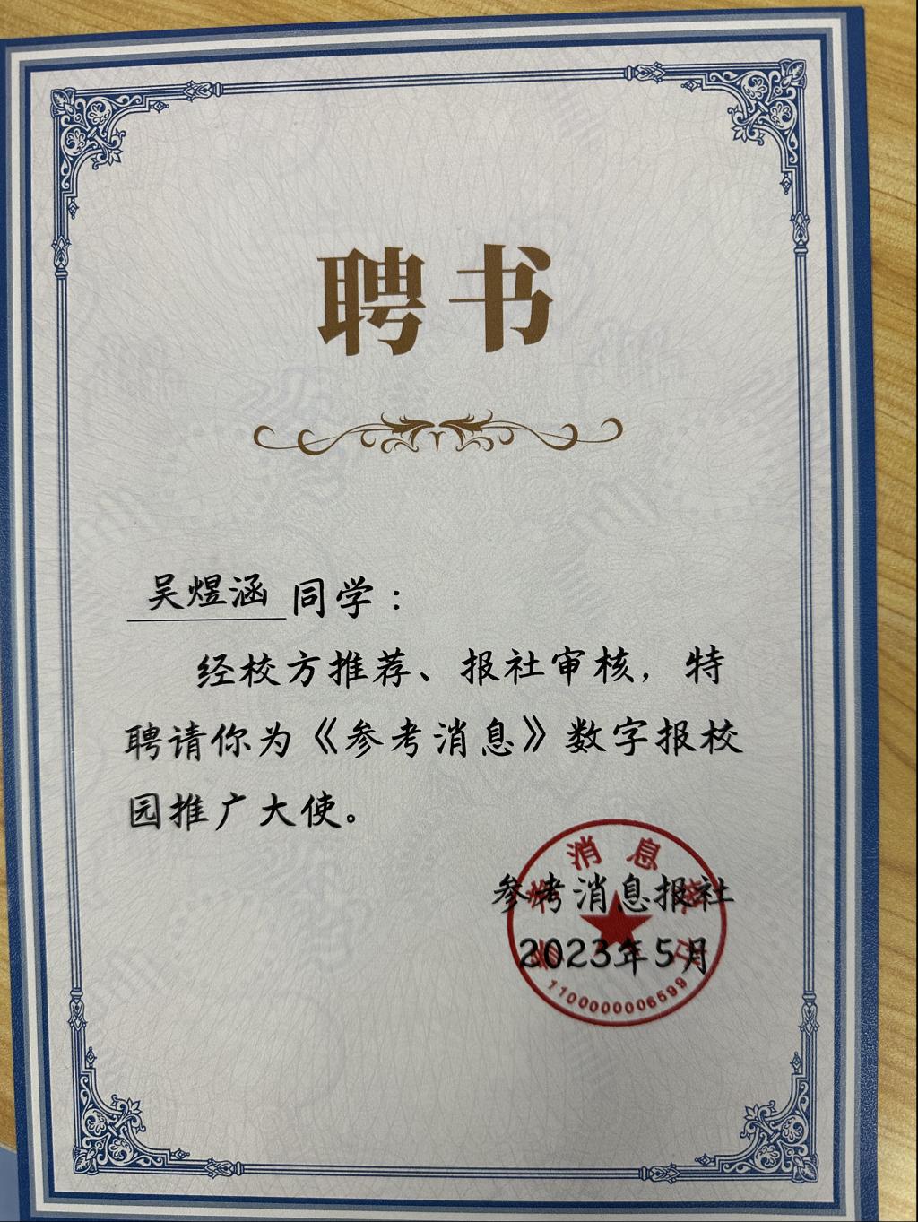 《参考消息》是由新华通讯社主办、参考消息报社编辑出版,于1931年11月7日在江西瑞金创刊,是国内发行量第一、世界排名第五的报纸,拥有日均340万份的发行量。被聘为《参考消息》数字报校园推广大使后,吴煜涵同学表示:要立志做敢于担当民族复兴大任的校园推广大使,让更多同学了解《参考消息》,利用课余时间认真学习、阅读时事期刊,了解党的光辉奋斗史,从而更加珍惜我们现在的美好生活,坚定正确的思想方向,在思想上和党组织保持高度一致。