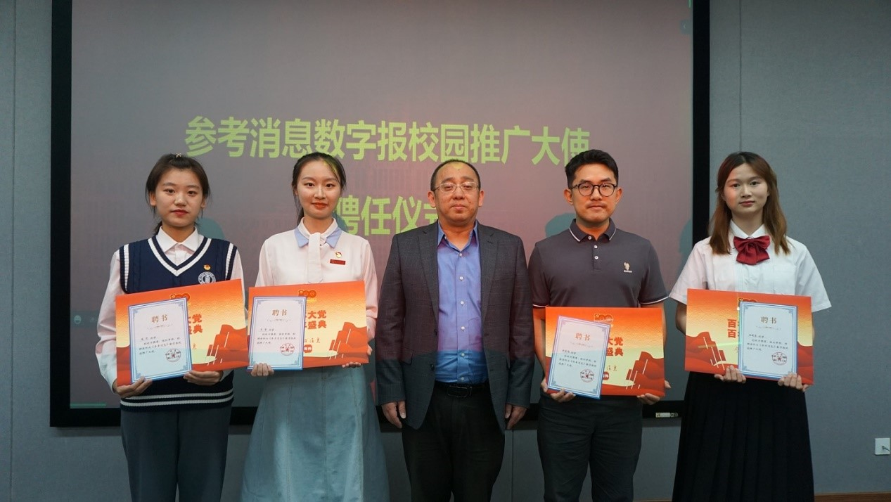 5月24日,在陕西省高校“学习贯彻党的二十大精神”大学生宣讲队集体备课会,我校商贸与流通学院电子商务2102班学生吴煜涵受聘成为《参考消息》数字报的校园推广大使,参考消息报社党委书记、社长周效政为吴煜涵等受聘同学颁发聘书。