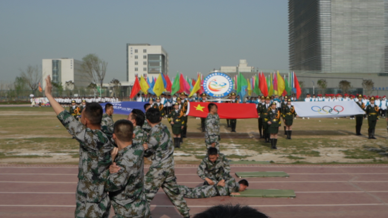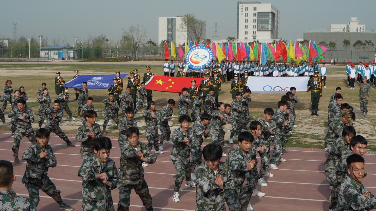 开幕式首先入场的是方阵代表队。每个学院的表演集中了大家的智慧和泪水,每个方队更是各班级风貌和思想品质的一次综合展示。商贸与流通入场方阵由81名学生组成,其中包含了26位退役复学学生。方阵以军旅为主要素,同学们身着迷彩服,用嘹亮的口号喊响学院“做红心商贸人,干阳光流通事”的价值导向,整齐划一的擒拿拳,热血沸腾的对训演练,彰显了商贸学子的爱党爱国爱校的神圣情怀。