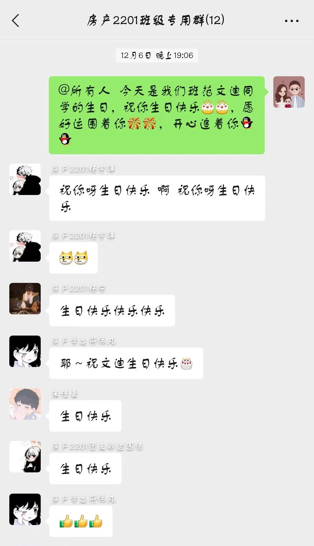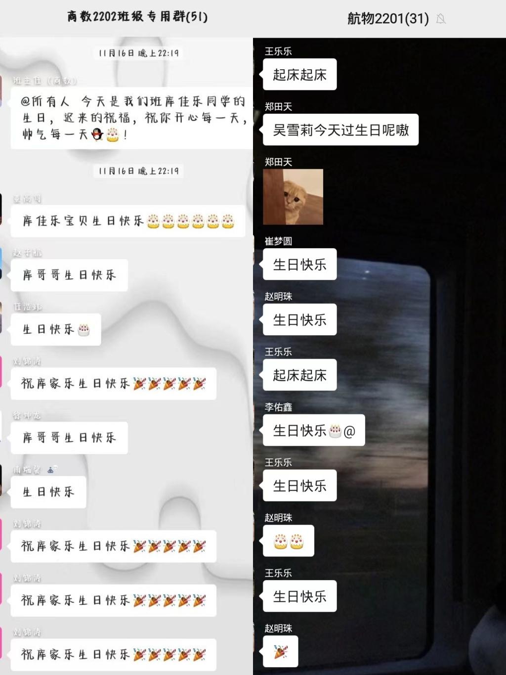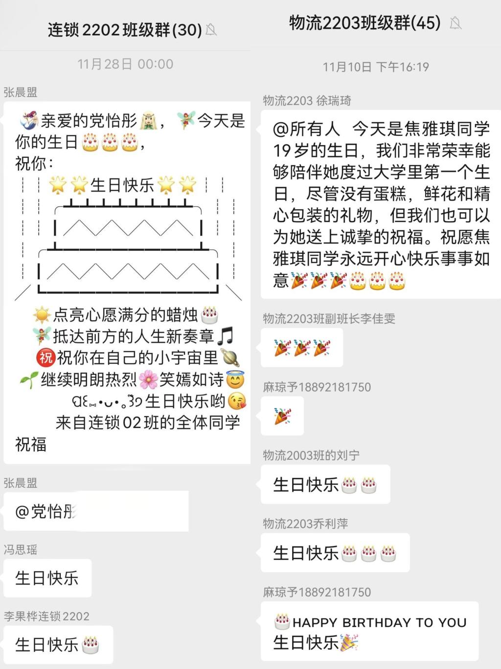 为增强学院学生归属感和幸福感,进一步提升班级凝聚力,营造温馨、团结的班级氛围,我院在所有班级内推行“生日提醒”活动。班干部提前了解清楚每一位学生的生日,并于生日当天在班级群发送生日提醒,鼓励全班同学献上生日祝福。