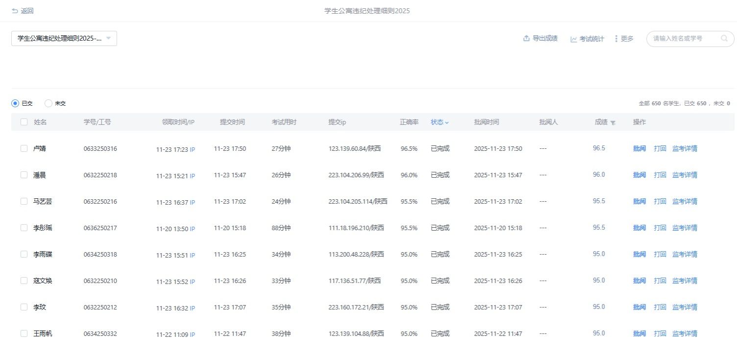 试题内容紧密围绕《学生公寓违纪处理细则》的具体条款,涵盖用电安全、内务卫生、行为规范、公共秩序、消防安全等核心内容,通过单选、多选、判断等题型,全面考察学生对规章制度的理解和掌握程度。同学们通过线上平台认真作答,在答题中学习,在学习中反思,进一步明确了公寓生活中的“红线”与“底线”,深刻认识到遵守纪律不仅是个人素养的体现,更是对自身及他人安全、对集体环境负责的具体行动。
