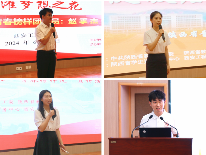 活动邀请到陕西省第二届“青春榜样团”成员西安工业大学赵季杰、西安石油大学接叶楠同学、西安工程大学张嘉轩,以及陕西省第二届国家奖学金获奖学生“青春榜样团”提名人选我校机械工程学院汪凡凡。西安工业大学赵季杰博士以《认真“答卷”,在科研的花园里浇灌梦想之花》为题进行宣讲,分享了自己在科研道路上的心路历程和奋斗之路。他结合自身经历与大家共勉,他说:“回首往事,我深切地感受到,人生没有标准答案,每一个选择都要坚持不懈。我们不但要答好高考的答卷,更要答好青春的‘答卷’、人生的‘答卷’”。西安石油大学硕士研究生接叶楠同学以《西部支教‘楠叶’茂 祖国绽放石油花》为主题,从支教微光汇扶志星火、科研小白欲上下求索、能源报国绽放石油花三个方面分享了自己的个人成长、追梦路上的所思所悟。西安工程大学本科生同学以《青春披锦绣,人生着华服》为主题,向我们讲述了她,刻苦钻研,勇于探索,积极投身志愿服务工作,以微笑面对挑战,用拼搏书写奋进,不忘初心,追光而行,用实际行动践行“崇真尚美,经纬天下”的大学精神。我校机械工程学院学生汪凡凡同学以《争做下一个火箭心脏“钻刻师”》为主题,向我们讲述了他利械报国,逐梦航天科技梦的成长经历,立志成为有理想、敢担当、能吃苦、肯奋斗的新时代好青年,用实际行动诠释新时代新青年的责任与担当,朝着火箭心脏“钻刻师”的大国工匠梦想砥砺前行,为航天事业贡献自己的青春力量。