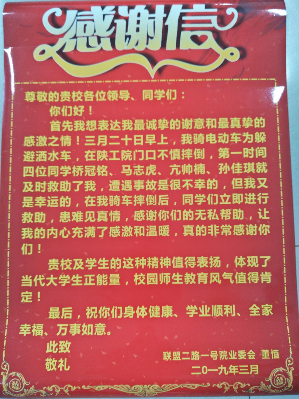 3月21日上午,当事人董恒携家人将一份感谢信和一面锦旗送到了陕西工业职业技术学院,他表示当天因躲避洒水车而不慎摔倒,这四名同学迅速反应并伸出援手,他非常感谢。这四名男孩在遇到一个让很多人困惑的问题——路遇摔倒的行人该不该扶时,他们毫不犹豫地扶起行人,以实际行动表明“扶不扶”不需要思考,只是举手之劳的本能。