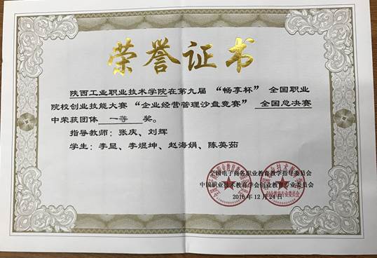 2016年12月25日,第九届全国职业院校企业经营管理沙盘模拟竞赛在山东泰安落下帷幕。来自全国29个省市、130余所高职院校、10余所本科院校的156只代表队参加了全国总决赛。经过6个多小时的激烈比赛,由我院物流管理学院连锁1501、1502班李显、李煜坤、赵海娟、陈英茹四名同学组成的参赛代表队获得团体一等奖,张庆、刘辉获得优秀指导教师称号。