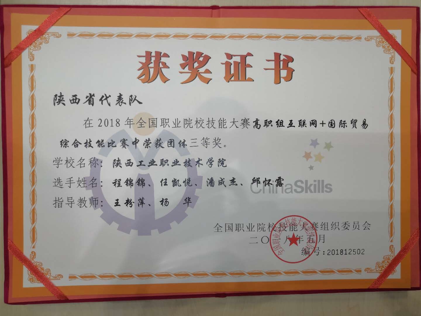 5月27日,2018年全国职业院校技能大赛“互联网+国际贸易综合技能”赛项(高职组)在无锡商业职业技术学院落下帷幕。经过两天的激烈角逐,最终由我院物流管理学院王粉萍、杨华老师指导,市场营销1602班潘成杰、任凯悦、商务英语1601班程锦锦、商务英语1602班邱怀露4名同学组成的代表队斩获团体三等奖。