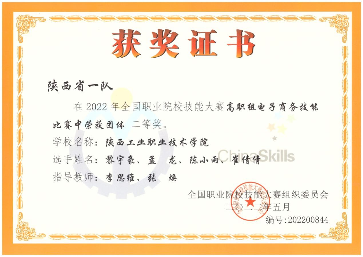 7月30日-31日,2022年全国职业院校技能大赛高职组“电子商务技能”赛项在安徽商贸职业技术学院举行,全国各省、自治区、直辖市以及新疆生产建设兵团的65支代表队参加了本次比赛。我院商贸与流通学院李思维、张焕、杨欣三位老师指导的黎宇豪、孟龙、崔倩倩和陈小雨四位同学组成的代表队代表陕西省参赛。经过两天的激烈角逐,最终荣获国赛团体二等奖。
