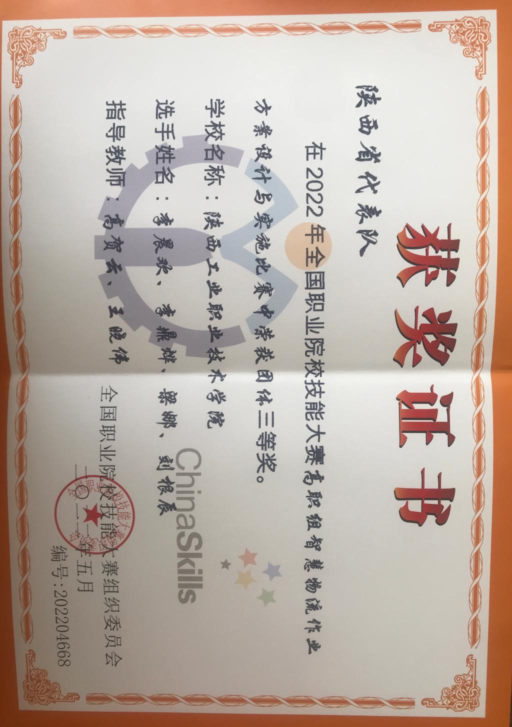 8月22日-24日,2022年全国职业院校技能大赛高职组(中诺思杯)智慧物流作业方案设计与实施赛项在天津交通职业学院举办。我校商贸与流通学院由高贺云、王晓伟老师指导,现代物流管理专业李晨欢、李鼎烨、梁娜、刘根辰4名同学组成的代表队斩获团体三等奖。