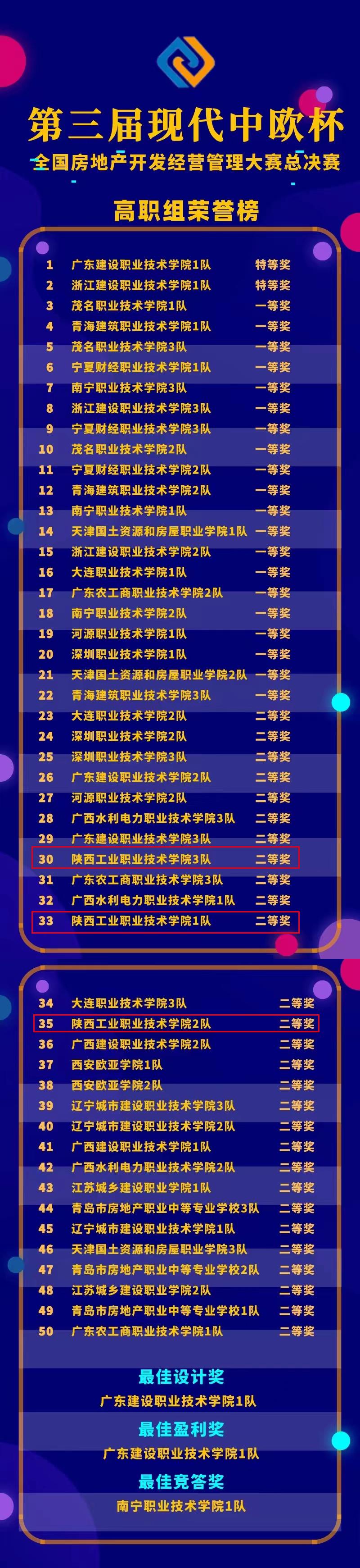 2022年11月13日,由北京市房地产法学会主办,首都经济贸易大学和北京现代中欧软件开发有限公司联合承办的第三届“现代中欧杯”全国房地产开发经营管理大赛总决赛落下帷幕,由我院孙菲、李倩老师指导,谢倩、张佳乐、周启华组成的陕工院3队;帅珍珍、张海云老师指导,党航远、相星宇、张文浩组成的陕工院1队;刘媛、卓永斌老师指导,陈晨、黄毅佳、陈怡冉组成的陕工院2队共三只参赛队伍,最终荣获二等奖3项。