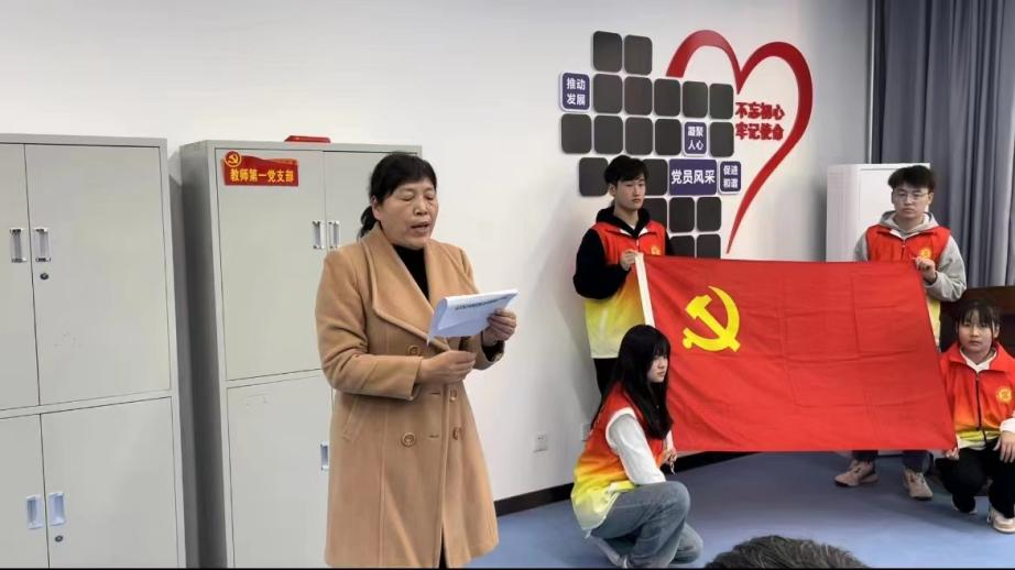 教师第一党支部书记晋淑惠宣读了学院党委《关于同意接收王霄同志为中共预备党员的批复》。在教师第一党支部组织委员高贺云同志带领下,王霄同志面向鲜红的党旗,举起右手握拳庄严宣誓,郑重表达为共产主义事业奋斗终身的雄心壮志。