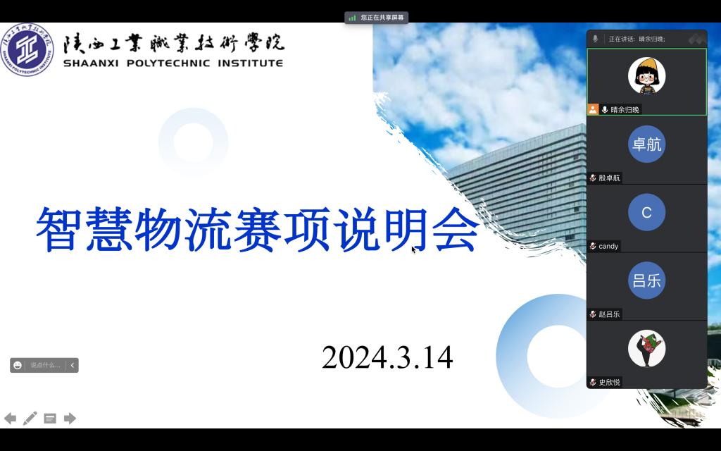 2024年3月14日,商贸与流通学院成功举办2024年陕西省职业院校技能大赛“智慧物流”赛项线上说明会。此次会议旨在向参加本次赛项的广大师生介绍智慧物流赛项的相关内容,推动学院物流专业的发展,并激发学生们对智慧物流领域的兴趣和热情。