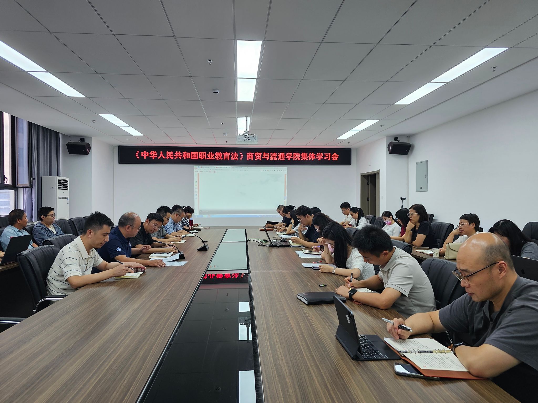 为深入贯彻落实国家职业教育发展战略,准确把握新修订的《中华人民共和国职业教育法》核心要义,切实将法律精神融入学院教育教学与专业建设全过程。9月15日,商贸学院在B604会议室召开《职教法》专题集体学习会。学院领导班子成员、各教研室主任及全体教职工参加本次学习,会议由学院党总支副书记、副院长张光主持。