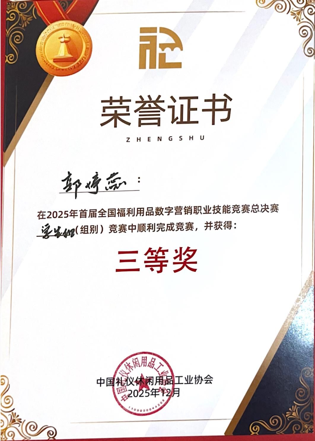 近日,首届全国福利品数字营销职业技能竞赛成功举办,本次技能大赛分为学生组和职工组,大赛内容涵盖视频剪辑、私域推文、总结优化分析等板块,重点考察学生对市场趋势推理以及数据分析的能力。商数教研室高度重视,安排刘瑞老师悉心指导,选派优秀同学参赛获得好成绩,我院商数2503班王鑫鑫荣获大赛二等奖,商数2501班郭婷蕊和商数2501班杜杰荣获大赛三等奖。