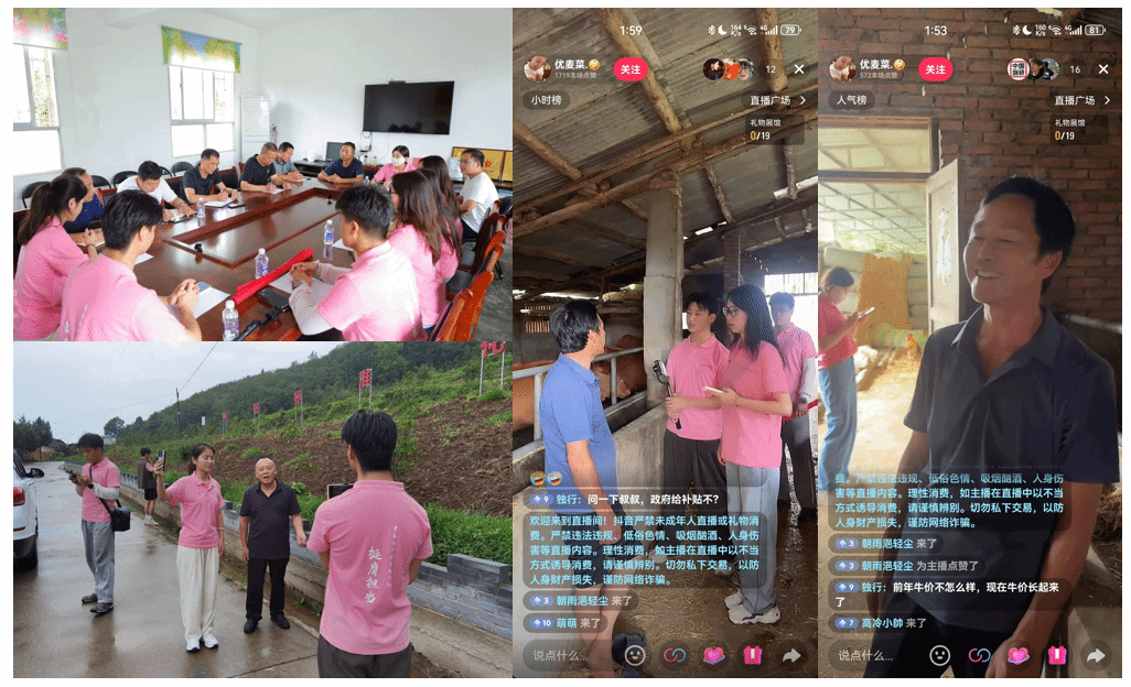 汽车在盘山公路上蜿蜒行进,窗外是连绵的青山和零散的农舍。实践团首站抵达汉滨区流水镇香山村,这个被群山环抱的村落面临着典型的发展困境。团队走访了黄牛养殖户、养蜂场,深入了解当地黄牛养殖、蜂蜜场的规模、技术、销售及面临的困难。团队成员结合专业所学,针对养殖户提出的品牌推广、电商销售等问题提出建议,并现场录制养殖环境、饲喂过程等视频素材,进行直播宣传。在与村干部开座谈会时了解到,该村为网格化管理,每个网格配备“1名党员网格员+2名村民协管员”,构建起覆盖1500余名村民的安全防护网。这种“党建引领、数字赋能、群众参与”的治理体系,正成为香山村乡村振兴的坚实根基。而往后商贸学院暑期大学生助力乡村振兴实践团将通过“暑期实践+线上服务+毕业设计”的常态化机制,在农产品品牌策划、乡村农旅规划等领域持续输出智力支持。