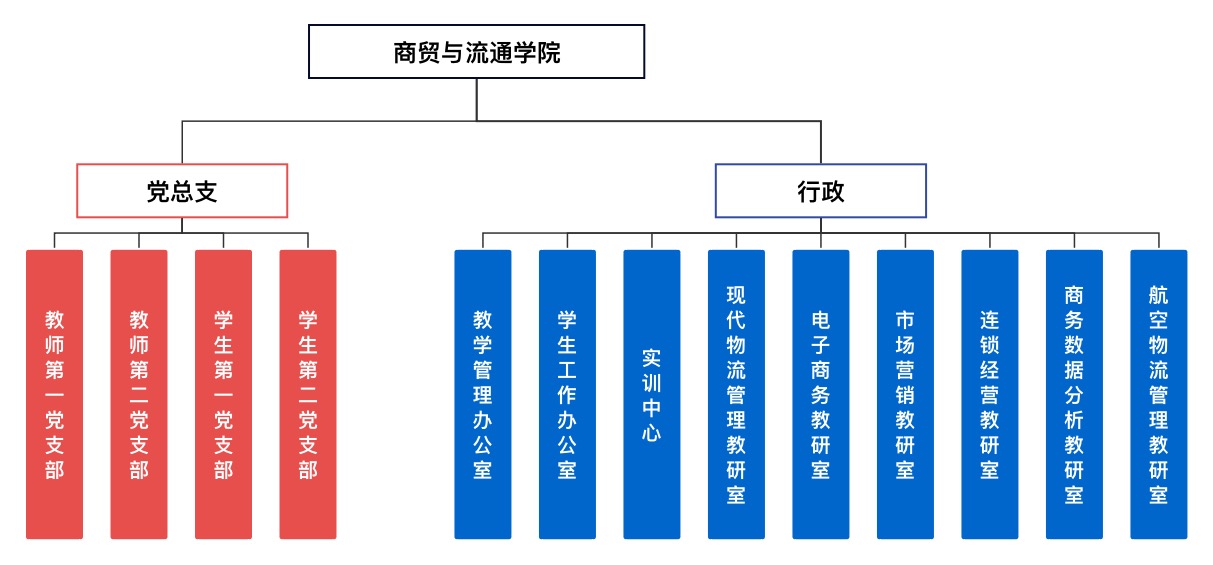 商贸与流通学院始终坚持“三重一大”制度,坚持党政联席会议制度,学院工作中的重大事项决策、重要人事变动、重大项目投资决策、大额资金使用均由党总支委员会议、党政联席会议(必要时召开扩大会议)讨论决定。商贸与流通学院目前下设教学管理办公室、学生工作办公室和实训中心三个科级部门。